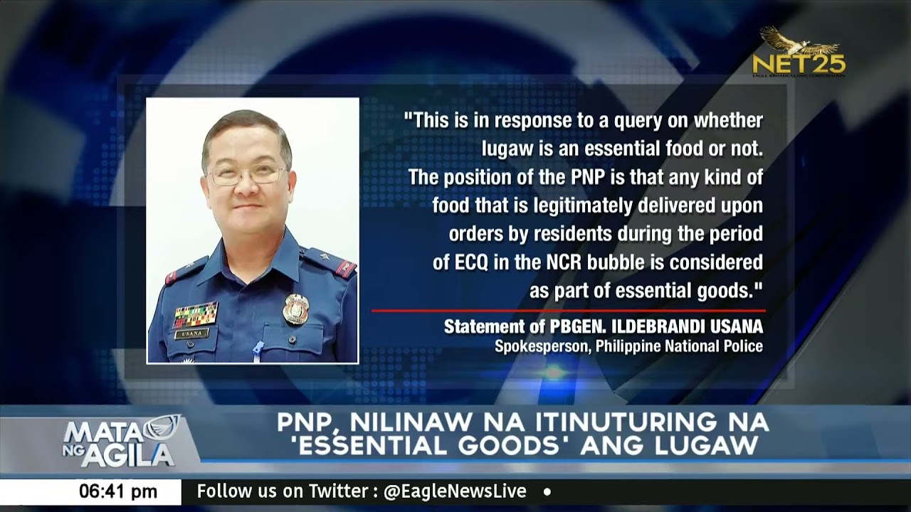 (Eagle News) — The Philippine National Police said that food deliveries should not be hampered or barred in the areas under Emergency Community Quarantine (ECQ) amid a viral video that showed a motorcyle delivery man about to deliver “lugaw” or rice porridge being stopped by a barangay official in Bulacan.