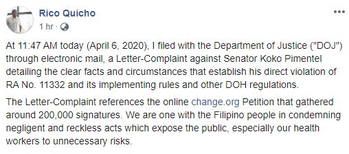 (Eagle News) -- A lawyer has filed a complaint against Senator Koko Pimentel for his alleged breach of his self-quarantine…