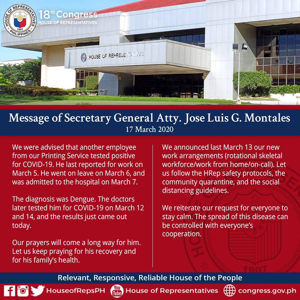In a statement issued on Tuesday, March 17, House Secretary General Atty. Luis Montales said that the employee last reported for work on March 5, went on leave on March 6, and was admitted to the hospital on March 7 where he was initially diagnosed with dengue.