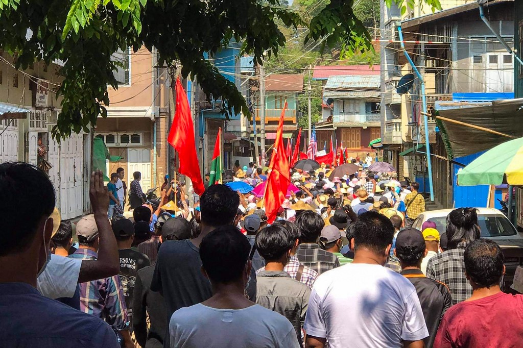 Across the country, anti-coup protesters continue to march for democracy — with demonstrators in northern Hpakhant holding signs that said “Stay strong, Mindat”.