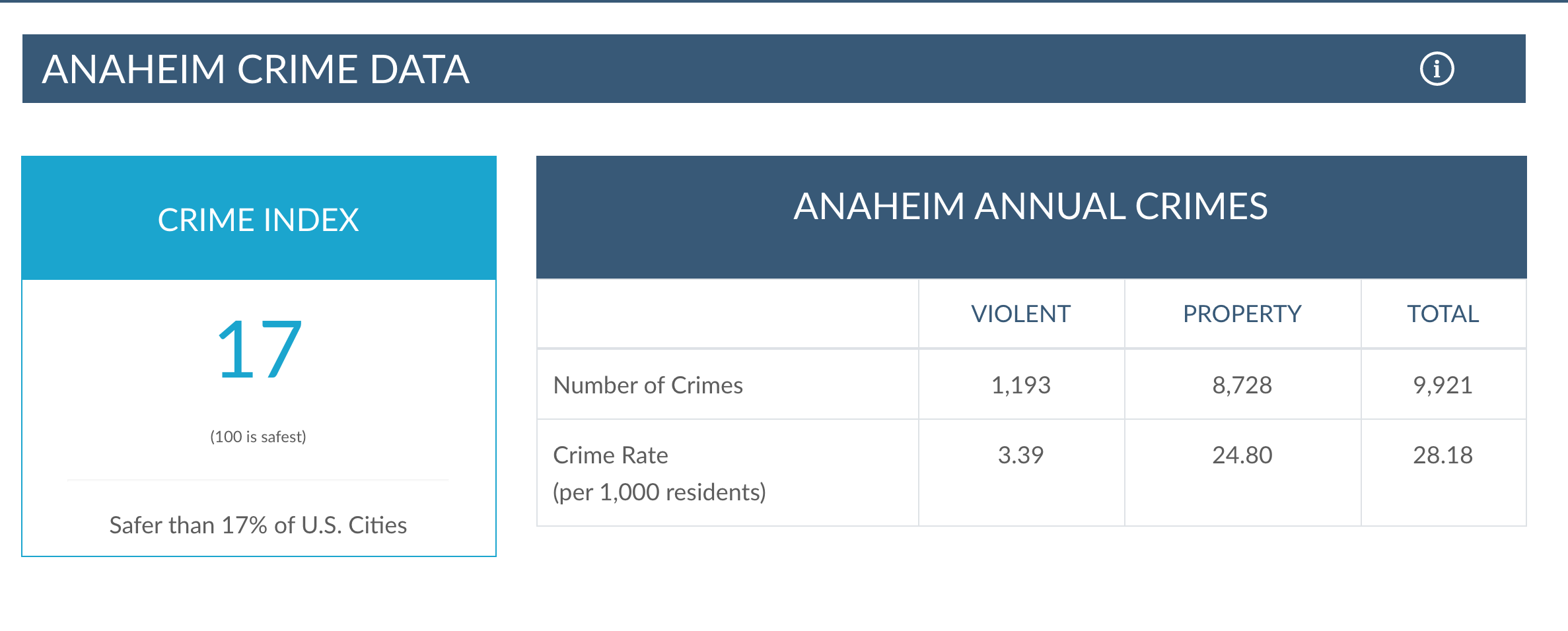 However, when you compare the data of “communities of similar population size, Anaheim has a crime rate that is noticeably lower than the average.”