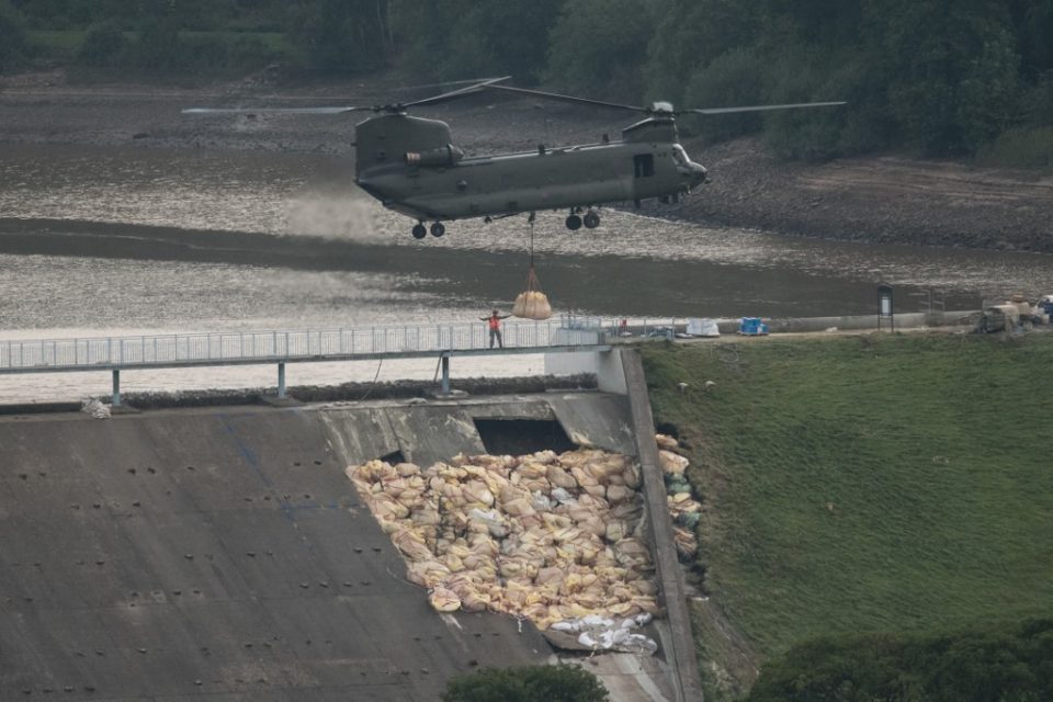A military Chinook helicopter has meanwhile also dropped 530 tonnes of aggregate to shore up the damaged part of the dam, and it is now being cemented into place.
