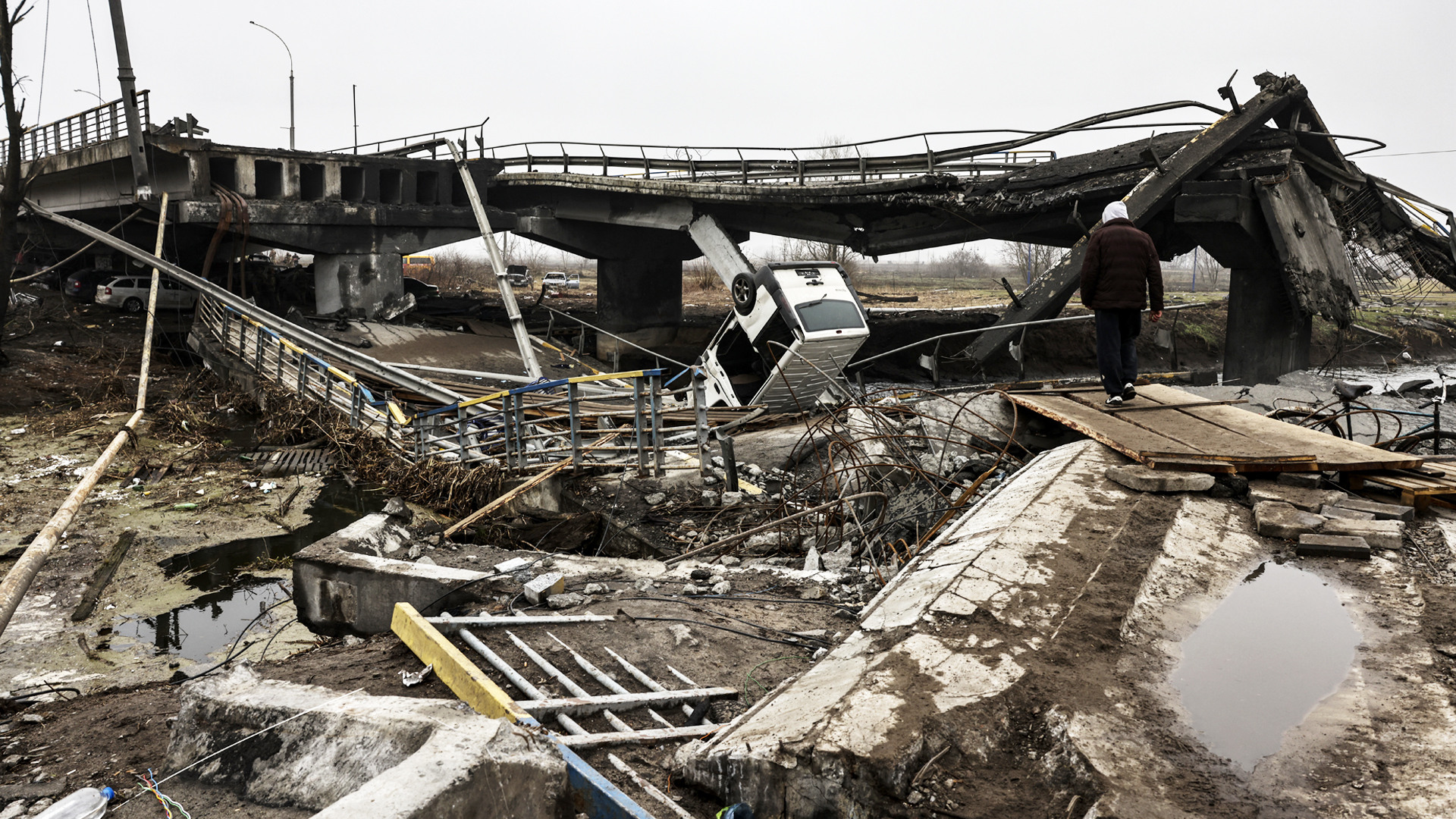 A destroyed bridge is pictured at the entrance of Irpin near Kyiv, on April 1, 2022, amid Russian invasion of Ukraine.