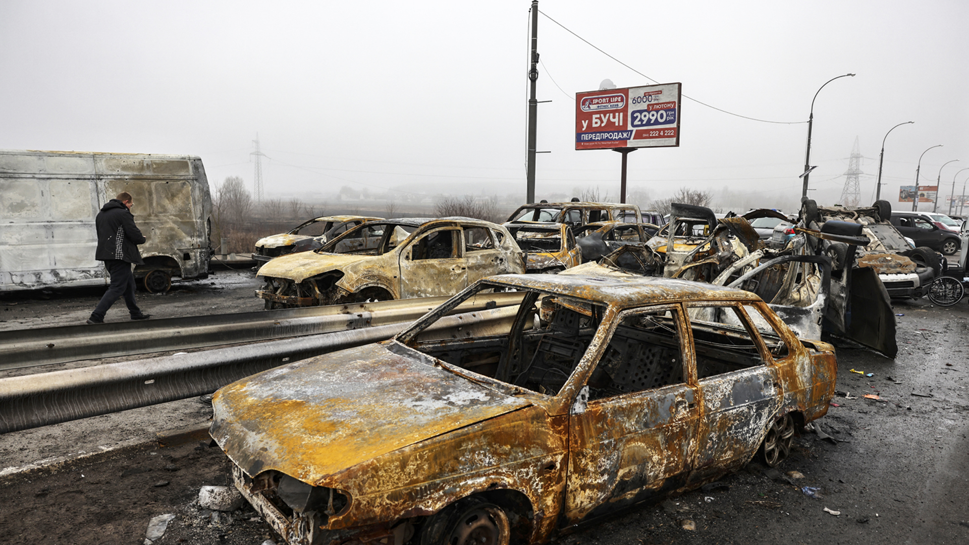 Burned cars are pictured at the entrance of Irpin near Kyiv, on April 1, 2022, amid Russian invasion of Ukraine.