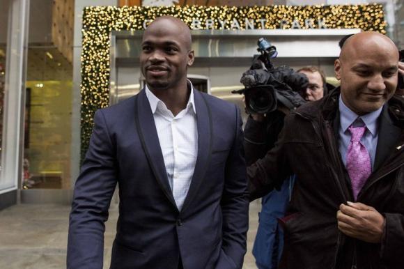 Suspended Minnesota Vikings running back Adrian Peterson (L) exits following his hearing against the NFL over his punishment for child abuse, in New York December 2, 2014. REUTERS/Brendan McDermid