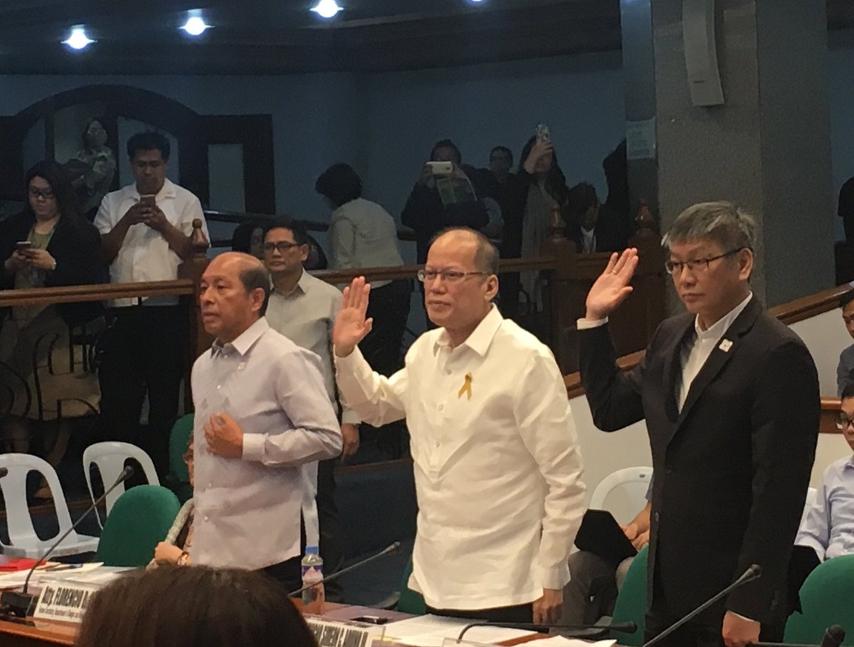 Former President Benigno Aquino III (C), his Budget Secretary Butch Abad (leftmost) and Executive Secretary Paquito Ochoa (rightmost) taking their oath in a Senate hearing on the Dengvaxia mess./Meanne Corvera/Eagle News Service/