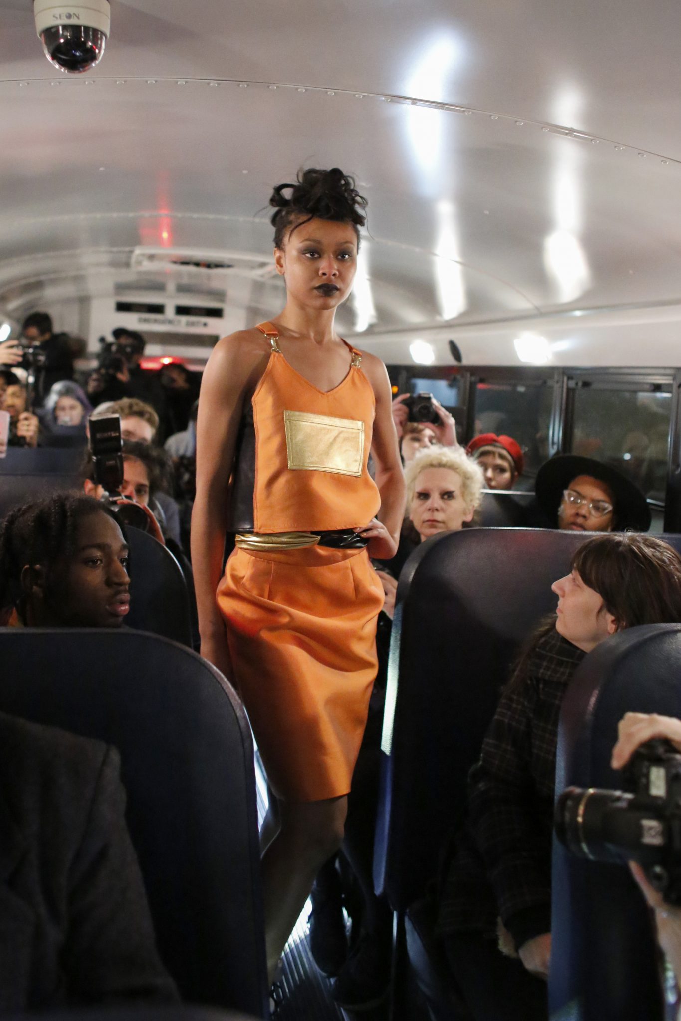 Amanda Mehl sent models sashaying down the narrow aisle of a standard American yellow school bus in vertiginous gladiator-style laced-up stiletto boots in school girl cool, all short skirts and hoodies.