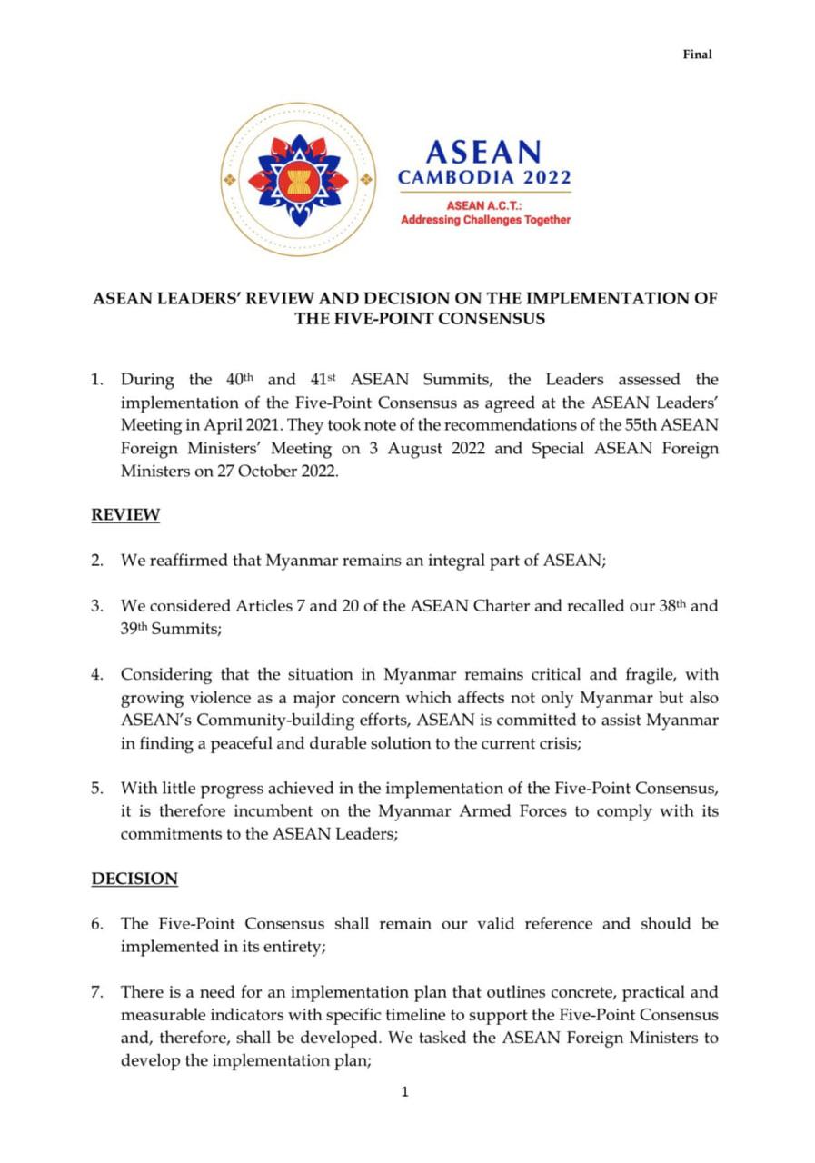 The five-point plan calls for an end to violence, dialogue between all sides in Myanmar mediated by the ASEAN envoy and humanitarian aid.