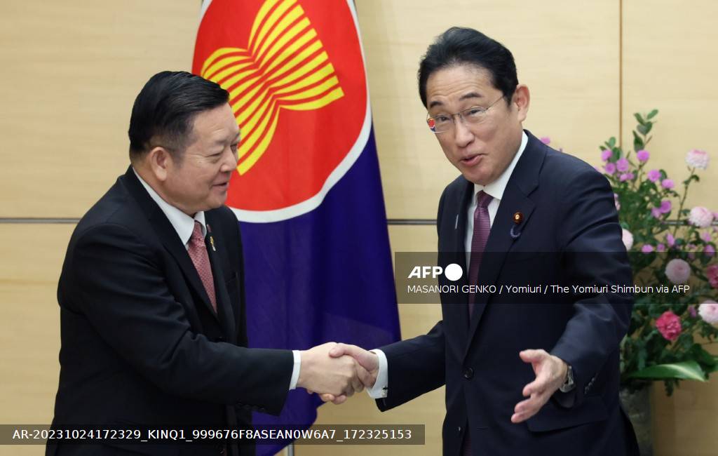 (FILE) KAO Kim Hourn, Secretary General of ASEAN (Association of South?East Asian Nations), meets Japanese Prime Minister Fumio Kishida at the prime minister’s office in Tokyo on October 24, 2023. —  Leaders from Southeast Asia and Japan will hold talks this weekend on boosting security ties with an eye on China, as well as Tokyo’s contentious efforts on energy cooperation. ( The Yomiuri Shimbun ) (Photo by Masanori Genko / Yomiuri / The Yomiuri Shimbun via AFP)