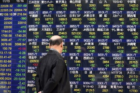 A pedestrian walks past an electronics stock indicator of the Tokyo Stock Exchange in Tokyo on November 15, 2017./ AFP/