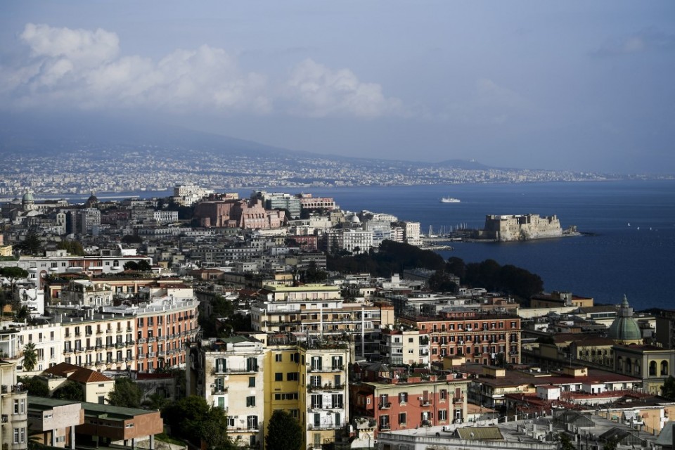 A general view shows the Chiaia district (Front), the Castel dell’Ovo fortress (Rear R) and the gulf of Naples on November 12, 2020 amid a surge of COVID-19 cases overwhelming hospitals. – The Italian government imposed tighter restrictions on another five regions on November 10 as it tries to stem escalating new cases of coronavirus, while still resisting a nationwide lockdown. (Photo by Filippo MONTEFORTE / AFP)