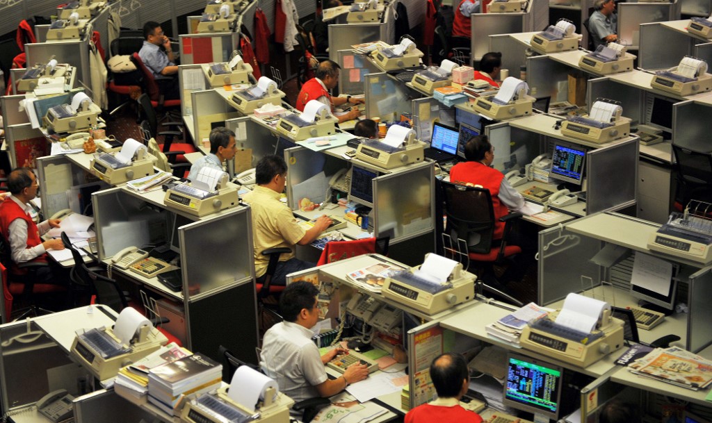 (FILE PHOTO) – Traders work the floor at the Hong Kong Stock Exchange in Hong Kong on October 6, 2011. Hong Kong shares soared 5.67 percent following a strong performance on Wall Street and on hopes European leaders will agree a plan to resolve the eurozone debt crisis. AFP PHOTO / LAURENT FIEVET (Photo by LAURENT FIEVET / AFP)