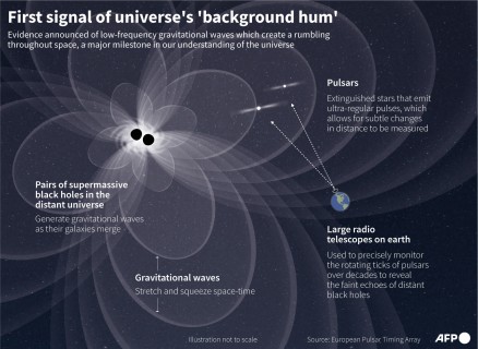 Daniel Reardon, a member of Australia’s Parkes Pulsar Timing Array, told AFP that — if confirmed — the waves would be “the sum of all of the supermassive black hole binary systems whirling around each other at the cores of galaxies everywhere in the universe”.