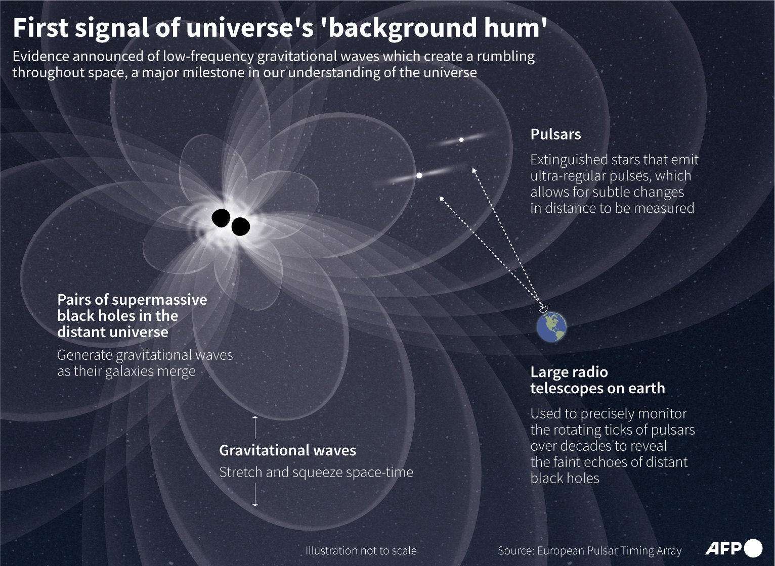 PARIS, June 29, 2023 (AFP) – Astronomers across the world announced on Thursday that they have found the first evidence of a long-theorised form of gravitational waves that create a “background hum” rumbling throughout the universe.