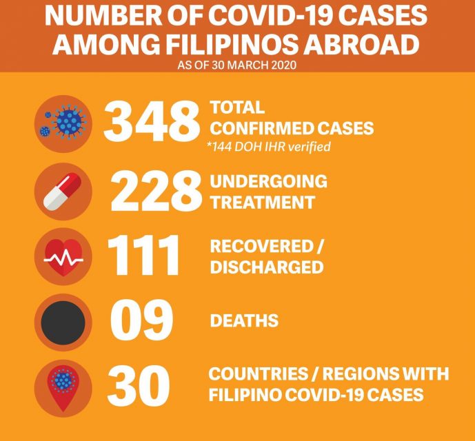 In its latest advisory, the DFA said that as of March 30, a total of 348 overseas Filipinos from 30 countries had been reported to have contracted the coronavirus infection.
