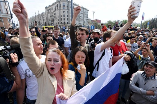 MOSCOW, Russia (AFP) — At least 350 people were detained at opposition protests across Russia on Saturday, as police violently attempted to disperse an unsanctioned rally in Moscow using tear gas, an independent monitor and AFP correspondents said.