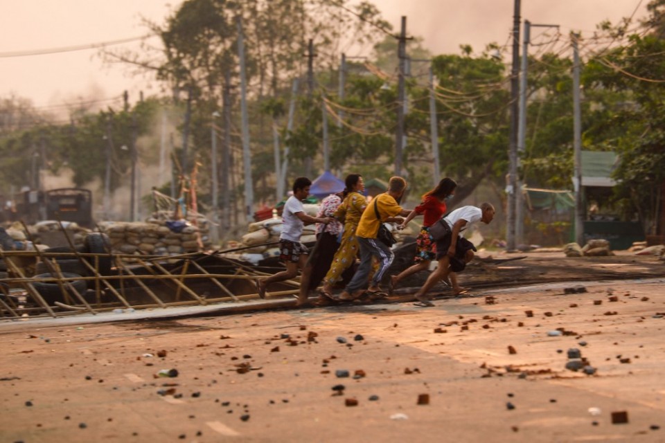 People run past makeshift barricades set up by protesters, during a crackdown by security forces on demonstrations against the military coup, in Hlaing Tharyar township in Yangon on March 14, 2021. (Photo by STR / AFP)
