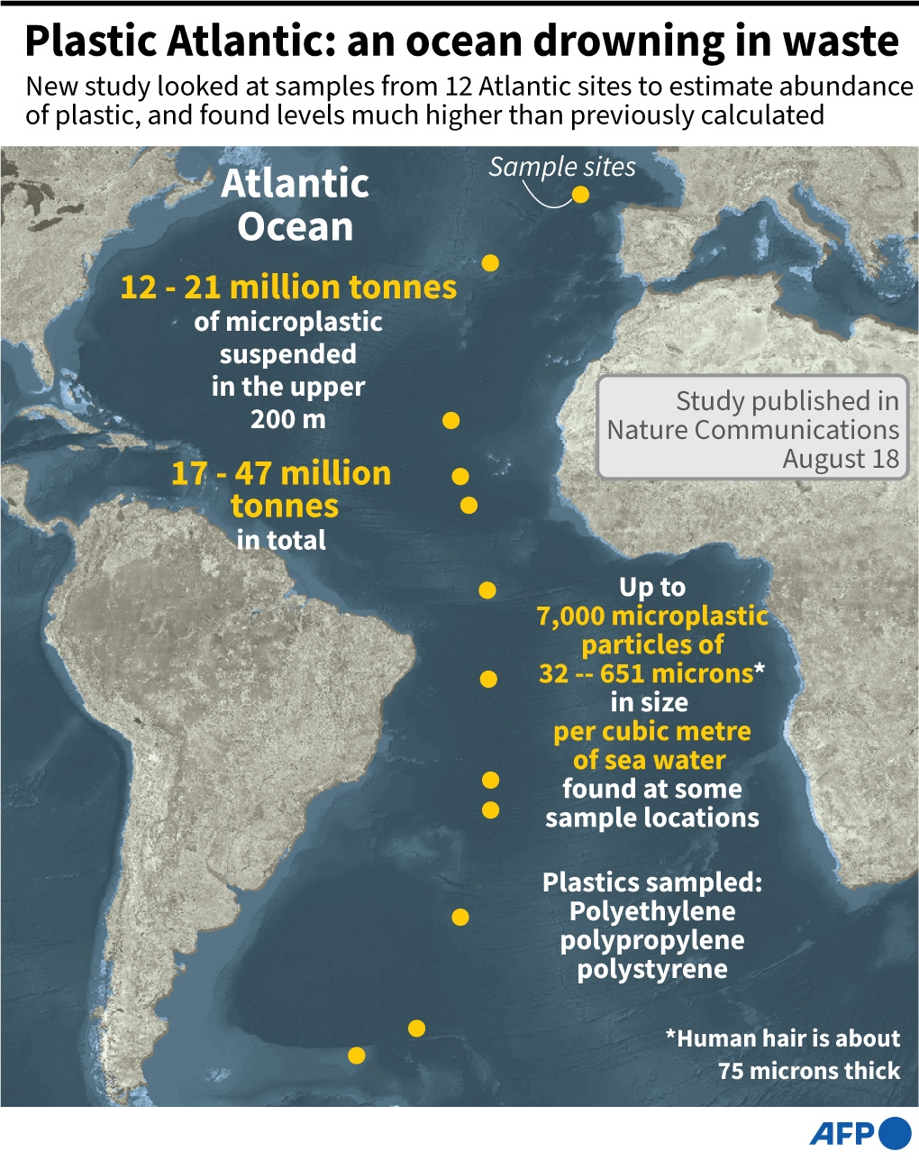 PARIS, France (AFP) — There may be more plastic floating just beneath the surface of the Atlantic ocean today than the estimated total weight of plastic waste dumped in it since 1950, new research showed Tuesday.
