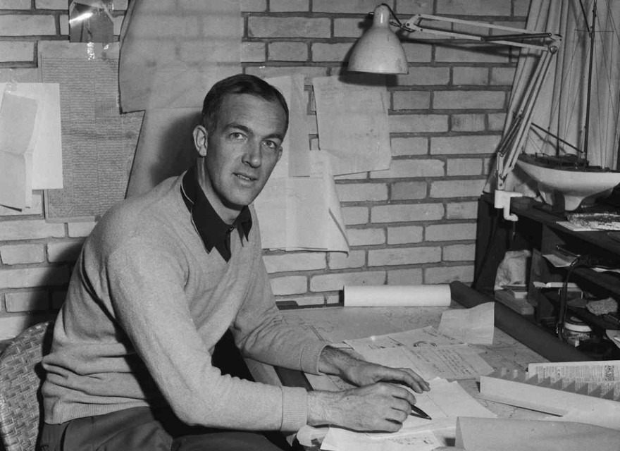 (FILES) Danish architect Jorn Utzon poses for a photo in his home in Elsinore on January 29, 1957. Australians on October 20, 2023 celebrate the 50th anniversary of the Sydney Opera House, lighting up the sails of a harbourside “masterpiece” that has become an international icon. (Photo by SCANPIX DENMARK / AFP)