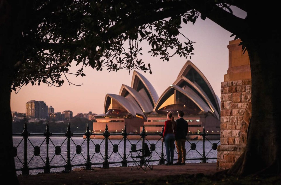 (FILES) Residents observe a moment of silence at dawn in front of the Opera House in Sydney on April 25, 2020. Australians on October 20, 2023 celebrate the 50th anniversary of the Sydney Opera House, lighting up the sails of a harbourside “masterpiece” that has become an international icon. (Photo by DAVID GRAY / AFP)