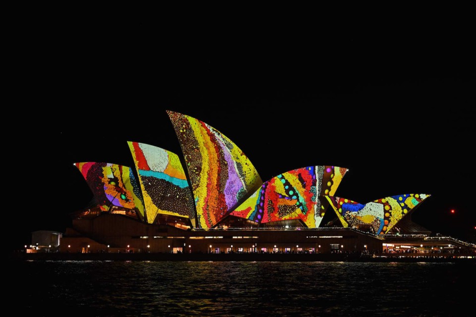 (FILES) The sails of the Opera House are illuminated with lights at the start of the Vivid Sydney festival in Sydney on May 27, 2022. Australians on October 20, 2023 celebrate the 50th anniversary of the Sydney Opera House, lighting up the sails of a harbourside “masterpiece” that has become an international icon. (Photo by Saeed KHAN / AFP)