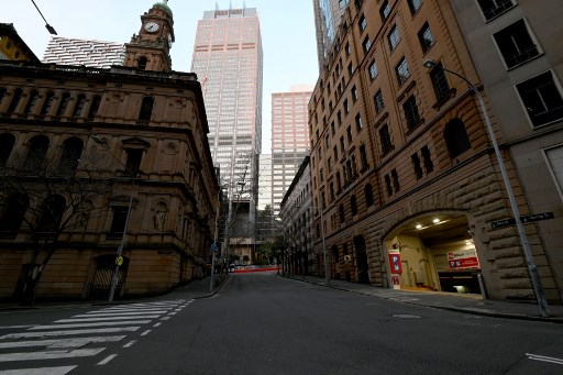 This picture taken on August 14, 2021, shows empty streets of the central business district of Sydney as Australia’s biggest city implementing tighter Covid-19 restrictions, including heavier fines and tighter policing to contain a Delta variant outbreak. (Photo by Saeed KHAN / AFP)