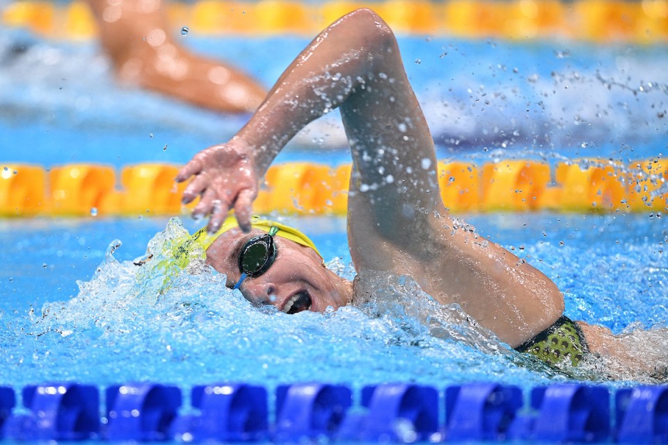 The Australian inched clear over the final 50m to touch in 3min 56.69sec. Only world record holder Ledecky has ever gone quicker.