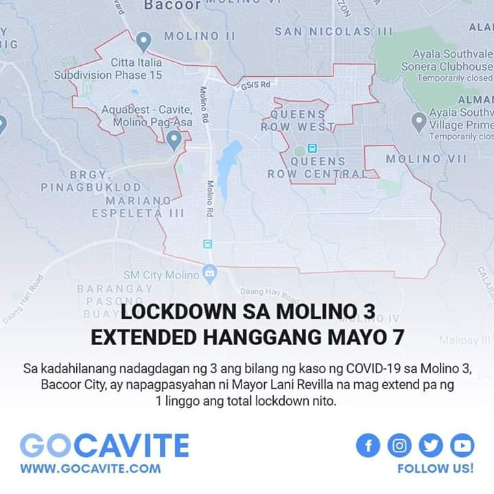 (Eagle News)–The Bacoor government has extended its lockdown of Barangay Molino III until May 7.