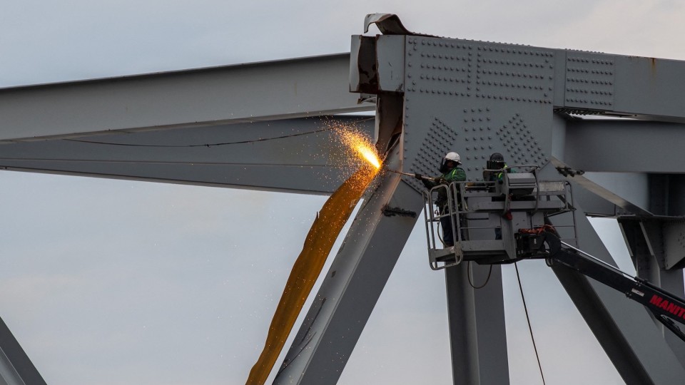 Demolition crews using blow torches sliced through the top part of the Francis Scott Key Bridge, which collapsed when the Dali cargo vessel lost power and struck it on Tuesday, killing six people.
