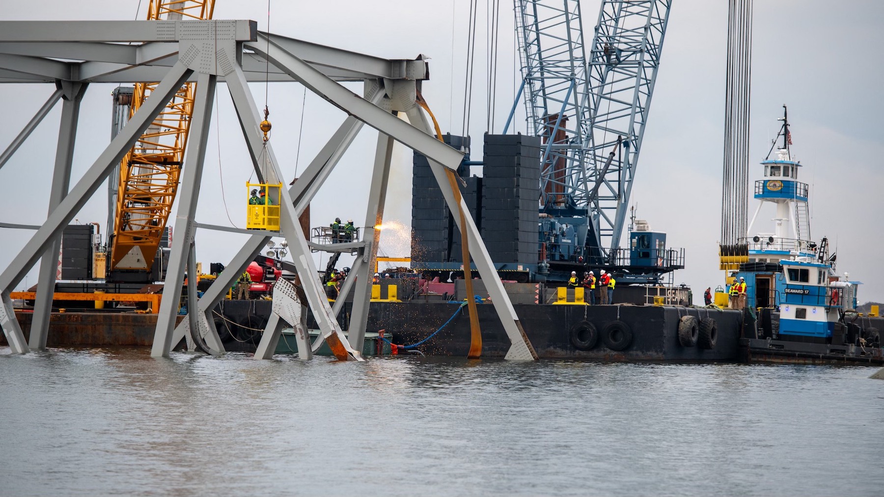 Demolition crews using blow torches sliced through the top part of the Francis Scott Key Bridge, which collapsed when the Dali cargo vessel lost power and struck it on Tuesday, killing six people.