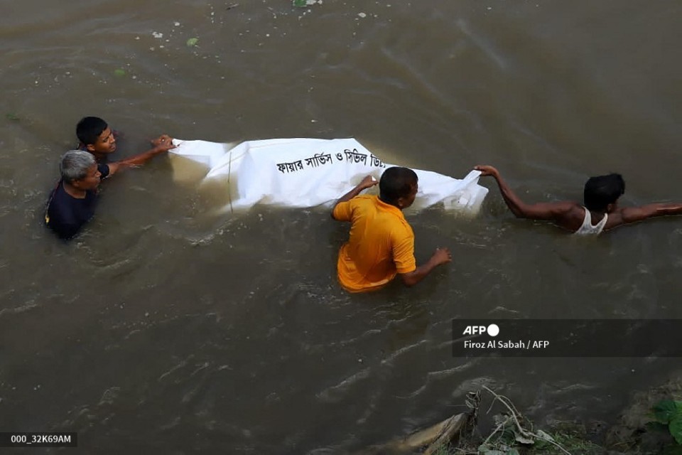 EDITORS NOTE: Graphic content / People pull the dead body of a victim who died after a boat capsized in river Karotoa near Boda town on September 26, 2022. – Rescue workers recovered 15 more bodies on September 26 after a boat carrying religious pilgrims capsized in Bangladesh, taking the death toll to 40 with dozens still missing, police said. (Photo by Firoz Al Sabah / AFP)