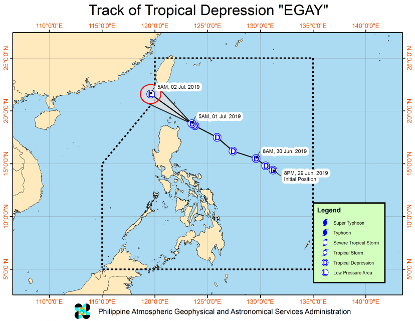 In its 8 a.m. weather bulletin, PAGASA said that the center of tropical depression Egay was estimated as 165 kilometers east of Aparri, Cagayan.