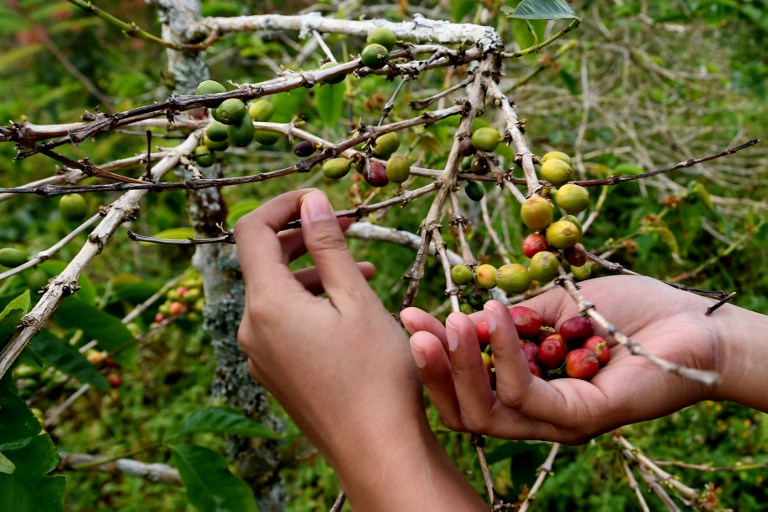During harvest season between May and September, dozens of workers scuttle from plant to plant picking the ruby red beans before they are processed at a large factory in Toraja and shipped out.