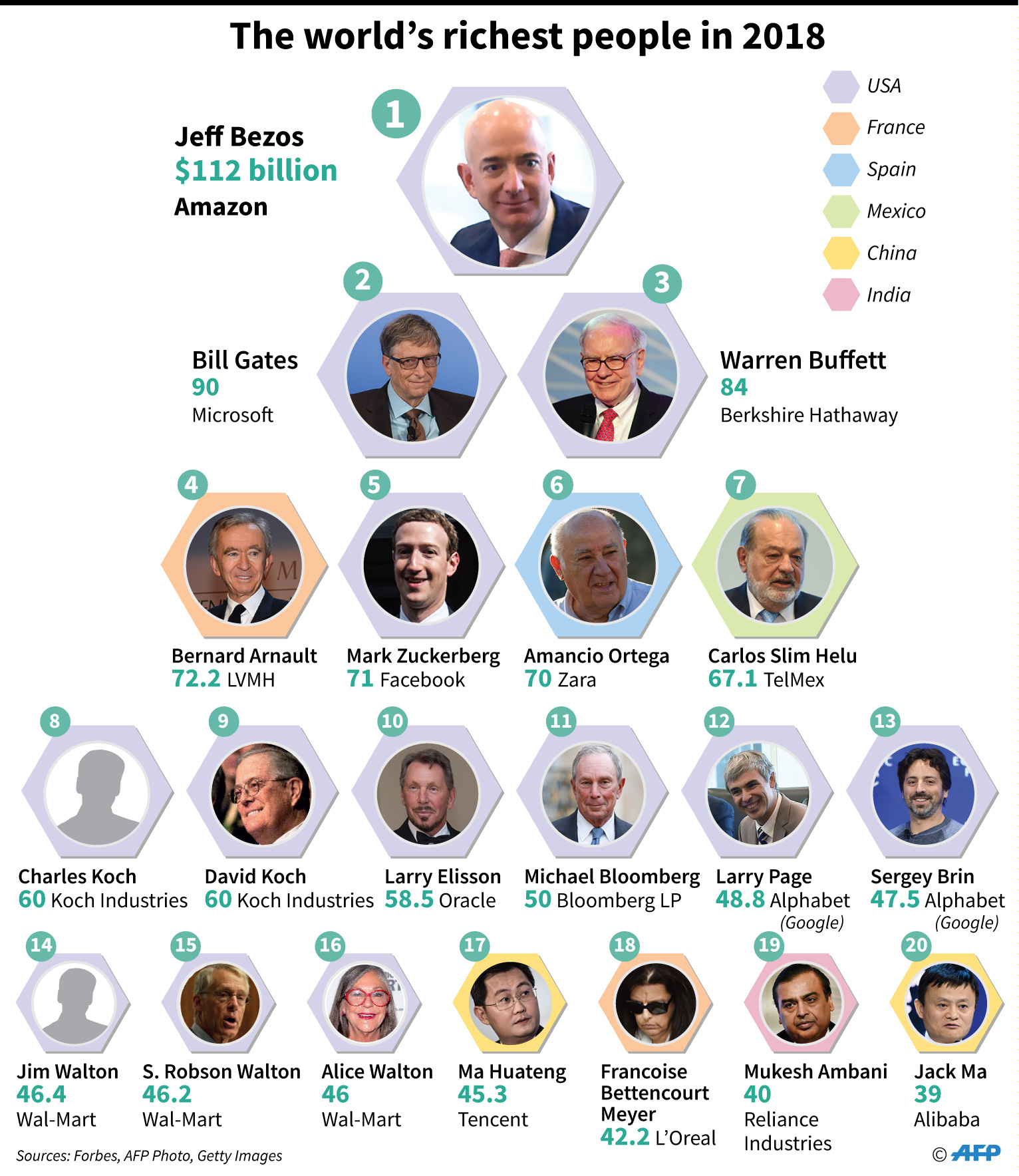 Two Chinese billionaires rose to be among the 20 richest people in the world: Ma Huateng, CEO of Chinese internet giant Tencent who is the richest person in Asia and number 17 in the world, and Alibaba founder Jack Ma.