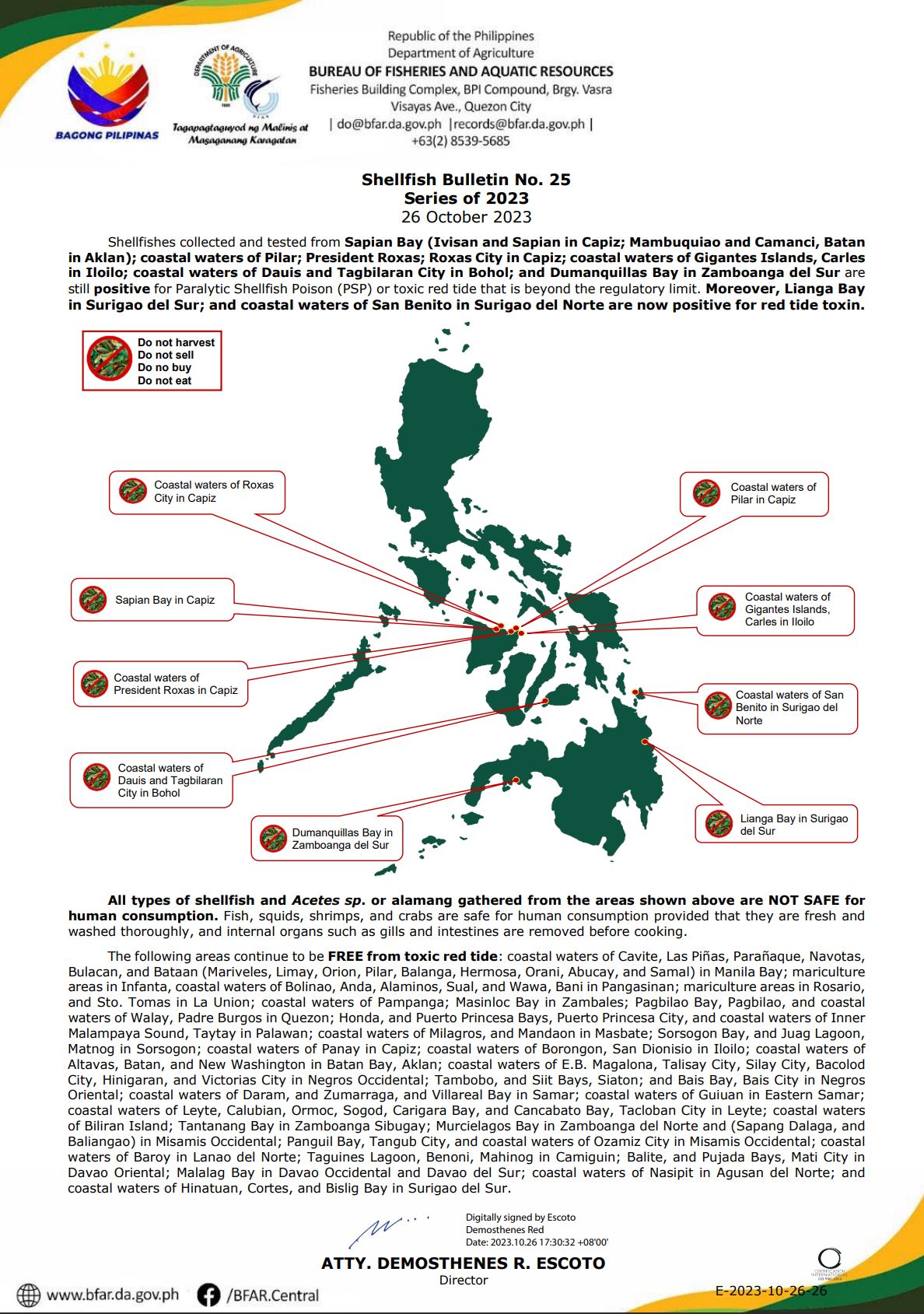BFAR said, as a result, all types of shellfish or alamang gathered from these areas are not safe for human consumption.