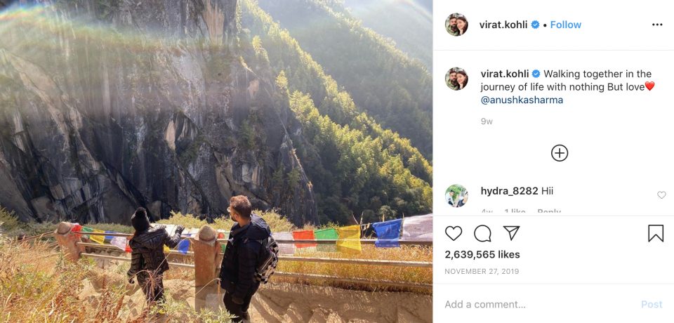 India’s superstar cricket captain Virat Kohli did much to publicise Bhutan when he posted on social media photos from a recent trip with his wife, Bollywood actress Anushka Sharma.