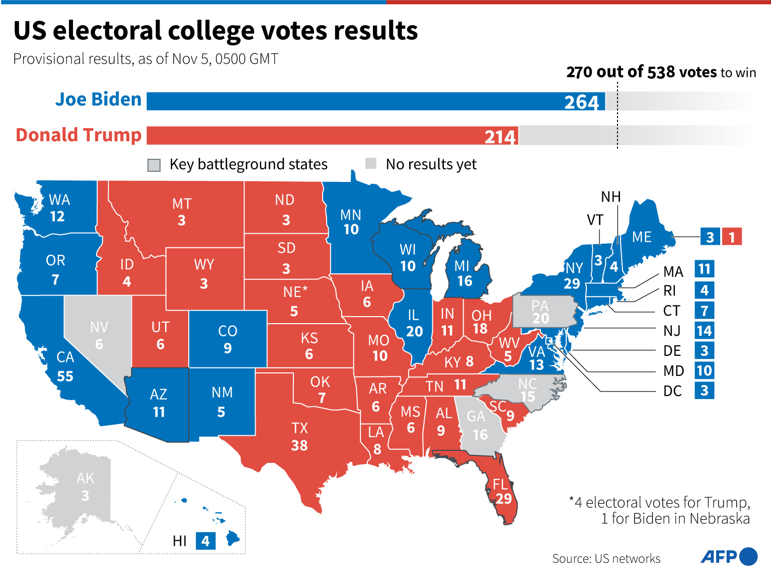 WASHINGTON, United States (AFP) — Democratic presidential challenger Joe Biden on Wednesday neared the magic number of 270 electoral votes needed to win the White House with several battleground states still in play, as incumbent President Donald Trump challenged the vote count.