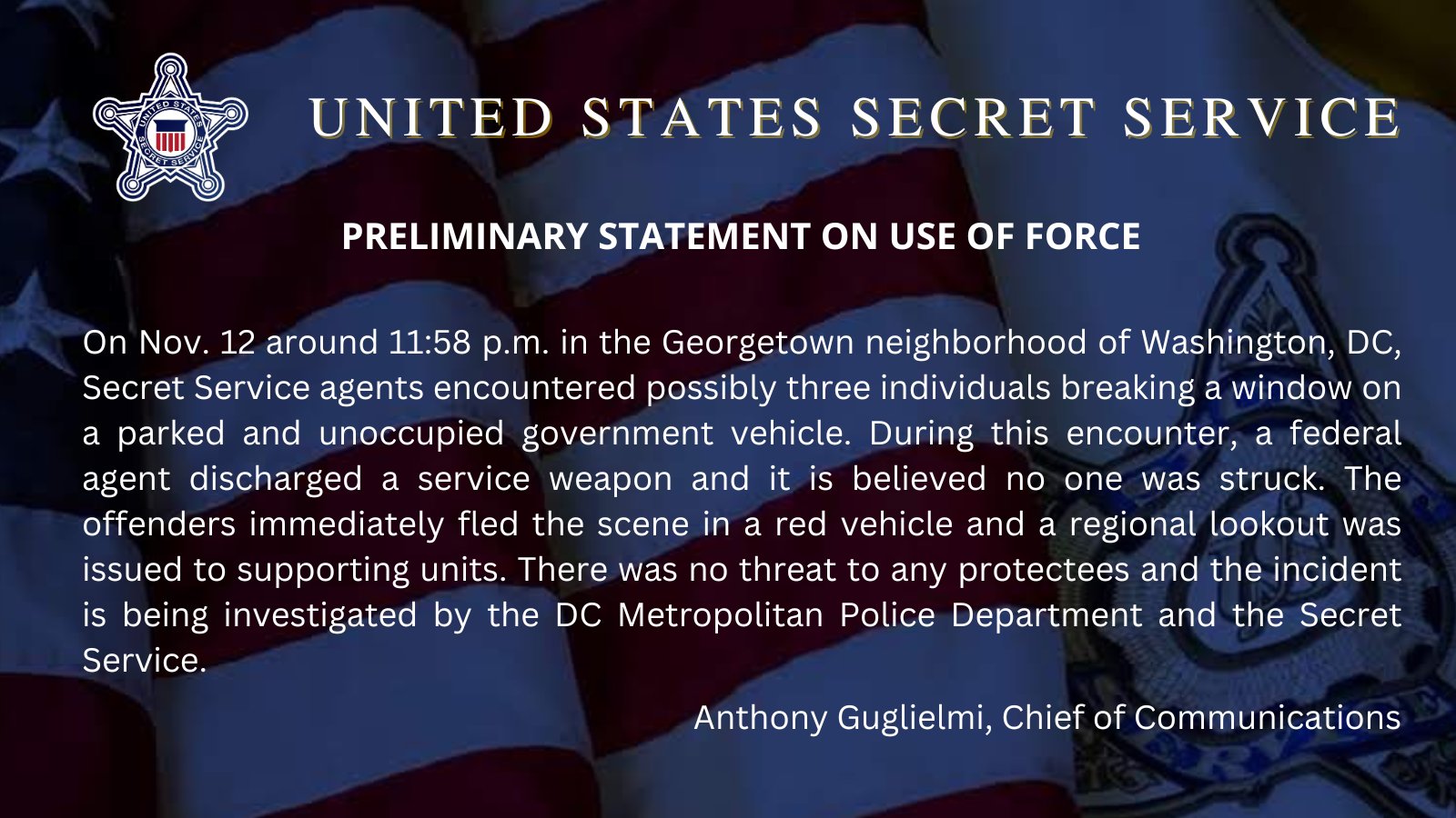 “On Nov. 12 around 11:58 pm…, Secret Service agents encountered possibly three individuals breaking a window on a parked and unoccupied government vehicle,” the presidential protection service agency’s spokesman Anthony Guglielmi said in a statement posted to X, formerly Twitter.