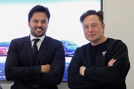 Handout picture released by the Brazilian Ministry of Communications showing Brazilian Minister of Communications Fabio Faria (L) and SpaceX and Tesla CEO Elon Musk posing durig a meeting at the Tesla headquarters, in Austin, Texas, on November 16, 2021. – According to Faria, through the partnership with the companies of Musk, Brazil will “expand the connectivity and protection of the Amazon”. (Photo by Cleverson OLIVEIRA / Brazilian Ministry of Communications / AFP)