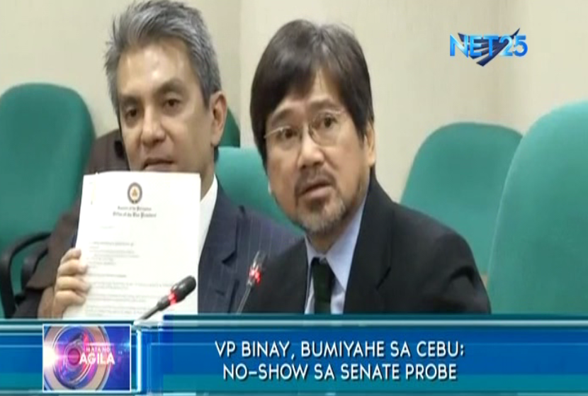 Binay, instead sent two representatives – his lawyer, Atty. JV Bautista, and Navotas Rep. Toby Tiangco – to the senate hearing Thursday, Nov. 6, to the dismay of the senators in the committee. The Vice-President decided to fly to Cebu instead to attend to other matters.