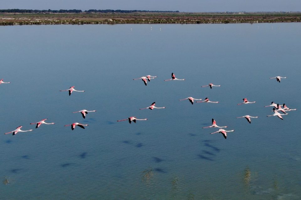 Beating their pink and black-lined wings, a growing flock of thousands of flamingos have recently been soaring over and splashing in the glistening waters of Narta Lagoon, an important site for migratory birds on the Adriatic coast.