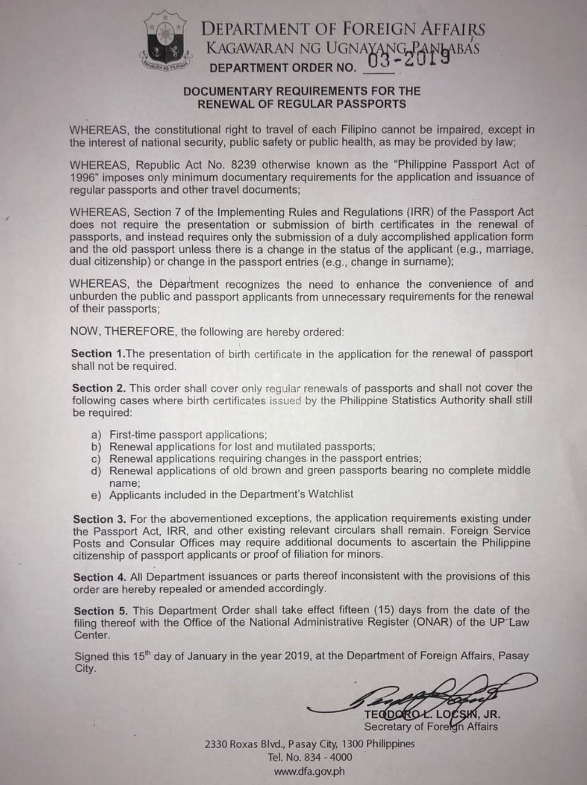 This was according to Department Order No. 03-2019 on the “Documentary Requirements for the Renewal of Regular Passports” signed by Foreign Affairs Secretary Teodoro Locsin Jr., on Tuesday, January 15.