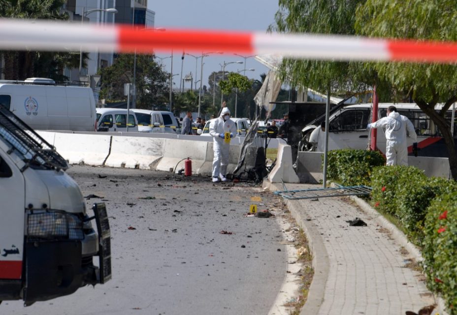Forensic experts investigate at the scene of an explosion near the US embassy in the Tunisian capital Tunis on March 6, 2020. – A blast that rocked Tunis today was an attack that targeted the US embassy and caused injuries among policemen, police said.