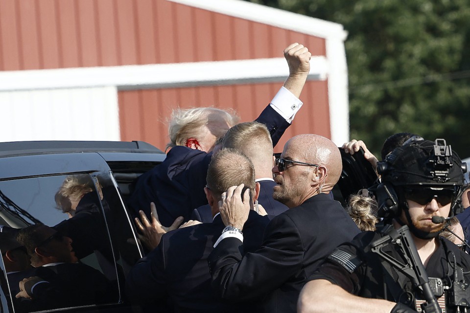 The former US president was seen with blood on his right ear as he was surrounded by security agents, who hustled him off the stage as he pumped his first to the crowd.