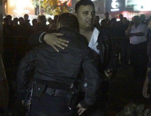 Police react as the body of a fellow police officer Mohamed Gamal is taken to an ambulance from the scene of a bomb blast in Cairo, April 18, 2014.