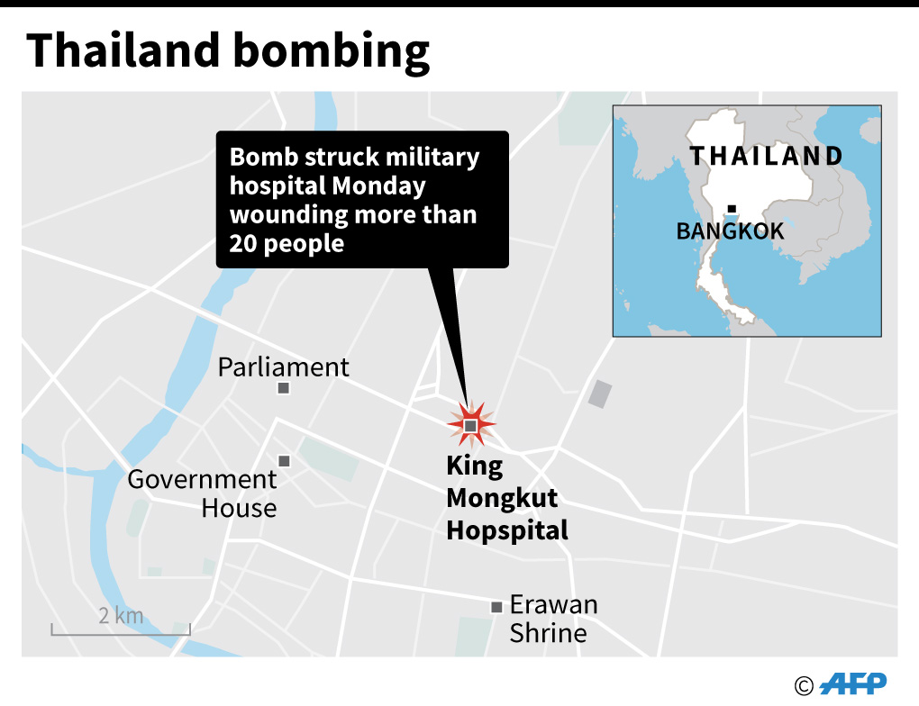 BANGKOK, Thailand (AFP) – A small bomb struck a Bangkok military hospital on Monday wounding more than 20 people, police said, three years to the day since the army seized power of the politically unstable kingdom.