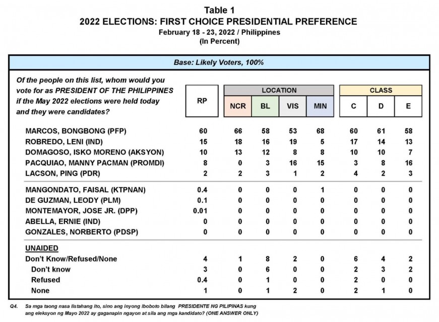 Marcos Jr., got 60 percent of the country’s registered voters who participated in the survey conducted from February 18 to 23, 2022 through face-to-face interviews.