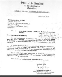 Presidential Spokesperson Salvador Panelo’s letter referring Antonio Sanchez family’s request for executive clemency to the Board of Pardons and Parole. The BPP denied Sanchez’s executive clemency bid.