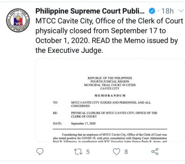 A memorandum from the Office of the Executive Judge Esperanza Paglinawan-Rozario said the temporary closure was after a member of its staff tested positive for COVID-19.