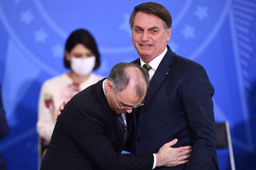 Brazilian President Jair Bolsonaro (R) is embraced by his new Justice Minister Andre Mendonca during his inauguration ceremony at Planalto Palace in Brasilia, on April 29, 2020. – Mendonca replaces Sergio Moro, who resigned after disagreements with President Bolsonaro. (Photo by EVARISTO SA / AFP)